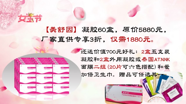 《美舒因》凝胶60盒(120支),原价5880元,会员专属福利3折,仅需1880元。凡购礼包即可得价值700元大礼包:2盒五支装凝胶和2盒外用凝胶或2盒五支装凝胶和泰国ATNNK面膜二组(20片,可六色任意搭配)